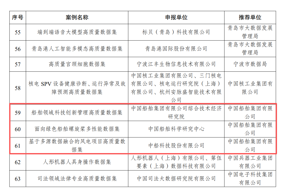 近日,國家數(shù)據(jù)局在2025中國國際大數(shù)據(jù)產(chǎn)業(yè)博覽會上發(fā)布了首批104個高質(zhì)量數(shù)據(jù)集典型案例。中國船舶集團有限公司旗下綜合院申報的“船舶領域科技創(chuàng)新管理高質(zhì)量數(shù)據(jù)集”、七〇二所申報的“面向綠色船舶的螺旋槳多性能數(shù)據(jù)集”、中船科技申報的“基于多源數(shù)據(jù)融合的風電項目高質(zhì)量數(shù)據(jù)集”成功入選并發(fā)布。