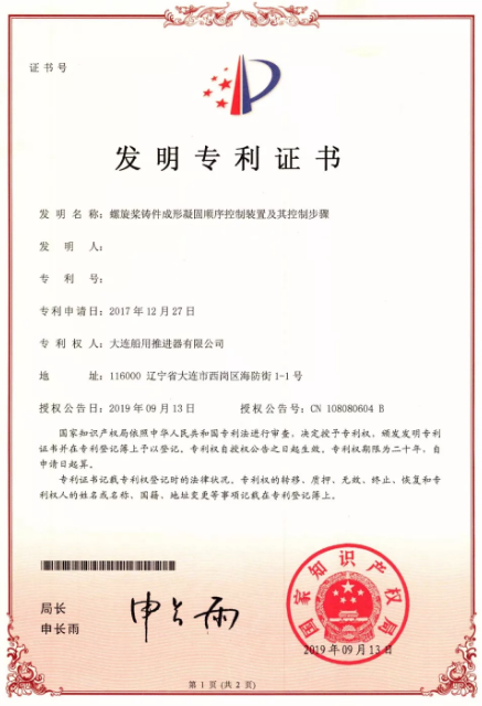 ????近日,大連船推申請(qǐng)的《螺旋槳鑄件成形凝固順序控制裝置及其控制步驟》發(fā)明專利通過國(guó)家知識(shí)產(chǎn)權(quán)局審查,獲得國(guó)家發(fā)明專利授權(quán)。
