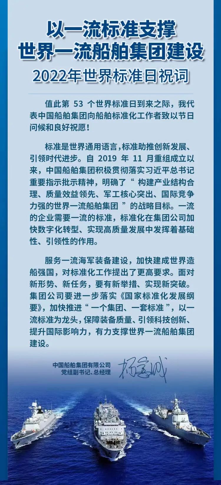 中國船舶集團(tuán)有限公司黨組副書記、總經(jīng)理?xiàng)罱鸪芍伦T~,強(qiáng)調(diào)集團(tuán)公司要進(jìn)一步落實(shí)《國家標(biāo)準(zhǔn)化發(fā)展綱要》,加快推進(jìn)“一個(gè)集團(tuán)、一套標(biāo)準(zhǔn)”,以一流標(biāo)準(zhǔn)為龍頭,保障裝備質(zhì)量、引領(lǐng)科技創(chuàng)新、提升國際影響力,有力支撐世界一流船舶集團(tuán)建設(shè),以優(yōu)異的成績迎接黨的二十大勝利召開。