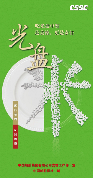 為認真貫徹落實習近平總書記關于制止餐飲浪費行為的重要指示精神,大力弘揚中華民族勤儉節約、珍惜糧食的文明用餐習慣,中國船舶集團積極開展“制止餐飲浪費 踐行光盤行動”專項宣傳引導活動。