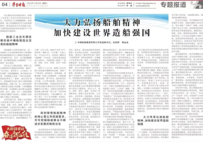 11月23日,中共中央黨校主辦的以思想理論宣傳為主旨的中央級大報《學習時報》刊發了中國船舶集團有限公司黨組副書記、總經理楊金成署名文章《大力弘揚船舶精神 加快建設世界造船強國》。