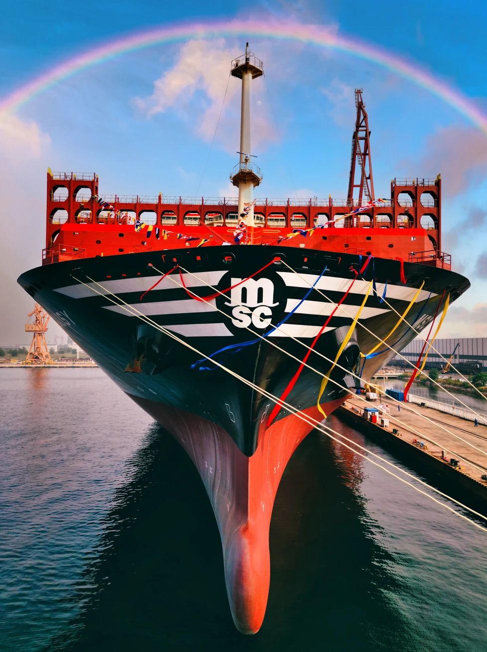 壯麗的船身如山巒一般,余暉映襯下,一位工人正駕駛高空車完成外板清潔施工,構(gòu)成一幅絕美的畫面。
