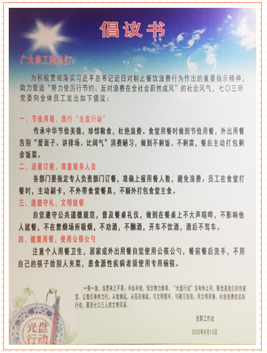 連日來,中國船舶集團多家成員單位積極踐行習近平總書記對制止餐飲浪費行為的重要指示精神,進一步加強宣傳教育,培養節約習慣。首先刊載有特色的宣傳海報、條幅,