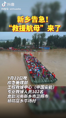 7月24日1時許,進占道路具備重型裝備通行條件,石料也已準備到位,決口封堵戰正式打響。在封堵現場,前一天在新鄉轉移被困群眾時立下頭功、被稱作“救援航母”的應急動力舟橋再次出現。