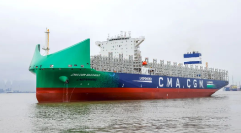 5月23日,由中國船舶集團旗下滬東中華聯合中船貿易為法國達飛集團建造的13000TEU液化天然氣(LNG)雙燃料動力集裝箱船系列4號船“CMA CGM SAOPAULO”號,在滬東中華長興島廠區命名交付。南美洲東海岸航線又將新添一艘中國“智”造的新一代綠色環保、高效節能型集裝箱船,為達飛集團箱船船隊綠色轉型發展貢獻新的中國船舶動能。