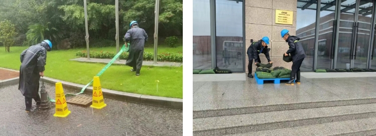 聯勤聯動,迅速構建“領導班子+部門負責人+一線員工”的高效運轉防汛指揮體系,黨員帶頭參與各園區現場24小時值守,在風雨中筑起守護資產安全與科研保障的堅實屏障;集配物資,為應對海嘯黃色警報,在前兩個月防汛防臺應急準備基礎上,迅速完成防汛物資清理,1小時內增設調配1000個沙袋、15臺抽水泵、30套應急照明等應急物資,并依據“一點一策”方案精準部署至各個重點防汛點位;鞏固排查,及時安裝完成各類防水密封效果更好的鋁合金擋水板,在地勢低洼處加設沙袋,對戶外建筑、高處設備和樹木等進行檢查和加固,確保萬無一失。