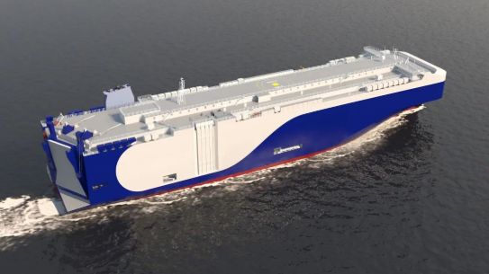 該船型由中國船舶集團旗下上海船院設(shè)計,總長200米,型寬38米,裝載能力9000車,可運輸電動車和常規(guī)燃料汽車以及其他類型的重型滾裝貨物。