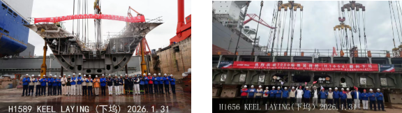 1月31日,外高橋造船建造的15.8萬噸蘇伊士型原油船H1589船及7000TEU集裝箱船H1656船順利下塢。