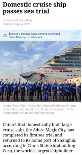 7月24日晚,首艘國(guó)產(chǎn)大型郵輪“愛達(dá)·魔都號(hào)”完成第一次試航所有試驗(yàn)項(xiàng)目比原計(jì)劃提前一天凱旋,人民日?qǐng)?bào)、新華社、中央電視臺(tái)等中央主流媒體進(jìn)行了報(bào)道。