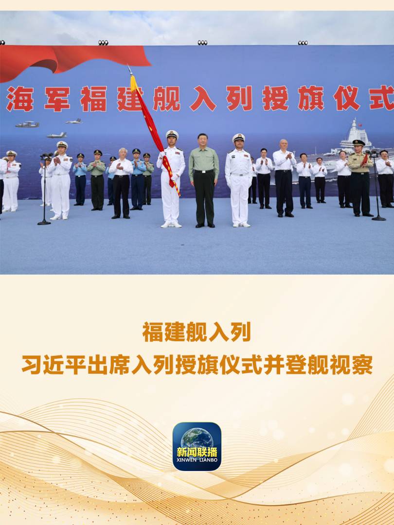 我國第一艘電磁彈射型航空母艦福建艦入列授旗儀式5日在海南三亞某軍港舉行。中共中央總書記、國家主席、中央軍委主席習近平出席入列授旗儀式并登艦視察。