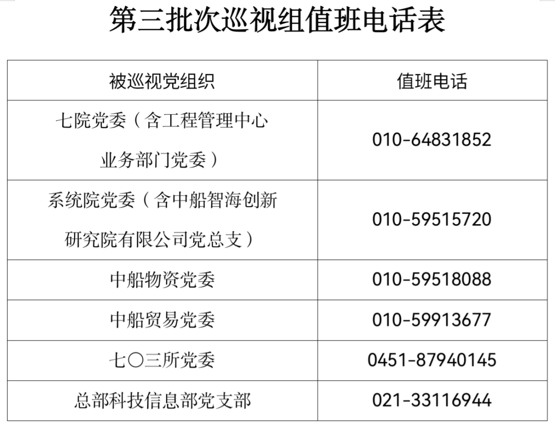 根據(jù)中船集團(tuán)黨組關(guān)于巡視工作的統(tǒng)一安排,截至8月26日,集團(tuán)公司黨組第三批次巡視完成進(jìn)駐工作。4個(gè)巡視組分別對(duì)七院黨委(含工程管理中心業(yè)務(wù)部門黨委)、系統(tǒng)院黨委(含中船智海創(chuàng)新研究院有限公司黨總支)、七〇三所黨委開(kāi)展常規(guī)巡視,對(duì)中船物資黨委、中船貿(mào)易黨委開(kāi)展巡視“回頭看”,對(duì)總部科技信息部黨支部開(kāi)展中央巡視整改專項(xiàng)巡視。