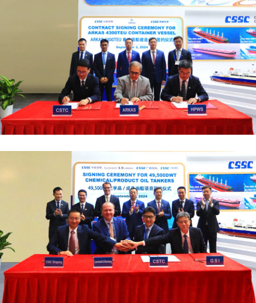此次展會(huì)上,集團(tuán)公司有關(guān)成員單位負(fù)責(zé)人率隊(duì)赴展會(huì)開展重點(diǎn)船海項(xiàng)目經(jīng)營洽談并拜訪當(dāng)?shù)睾椭苓厙抑饕蛻簟<瘓F(tuán)公司以“高端綠色、領(lǐng)跑未來”為參展主題,展臺(tái)設(shè)置了集團(tuán)總體區(qū)、高端綠色船舶區(qū)、先進(jìn)動(dòng)力配套區(qū)共3個(gè)展示區(qū)域,重點(diǎn)展示了首艘國產(chǎn)大型郵輪、27.1萬立方米超大型LNG(液化天然氣)運(yùn)輸船、10800車LNG雙燃料汽車運(yùn)輸船、全球首艘LNG雙燃料VLCC(超大型油船)、21萬噸氨燃料散貨船、9.3萬立方米超大型全冷式液化氣船等一系列技術(shù)含量高、全球競爭力強(qiáng)的高端綠色船型,以及CPGC-WinGD 10X92DF-M甲醇雙燃料發(fā)動(dòng)機(jī)、船用供氣系統(tǒng)、船用碳捕捉系統(tǒng)、船舶新能源動(dòng)力系統(tǒng)解決方案等滿足IMO(國際海事組織)當(dāng)前和未來排放要求的先進(jìn)動(dòng)力配套設(shè)備,充分彰顯了中國船舶集團(tuán)的國際化品牌形象及引領(lǐng)國際船舶市場創(chuàng)新發(fā)展的澎湃動(dòng)力。